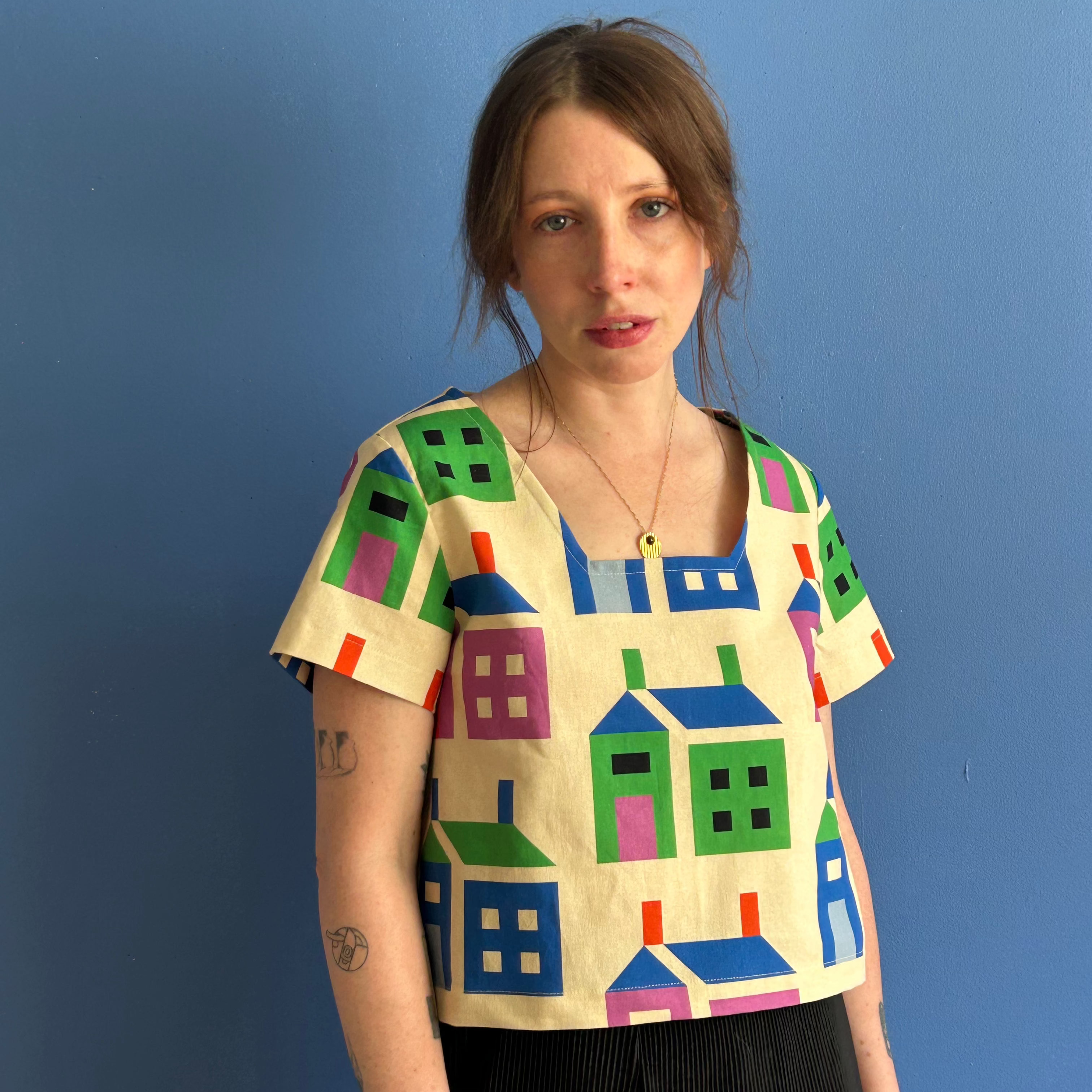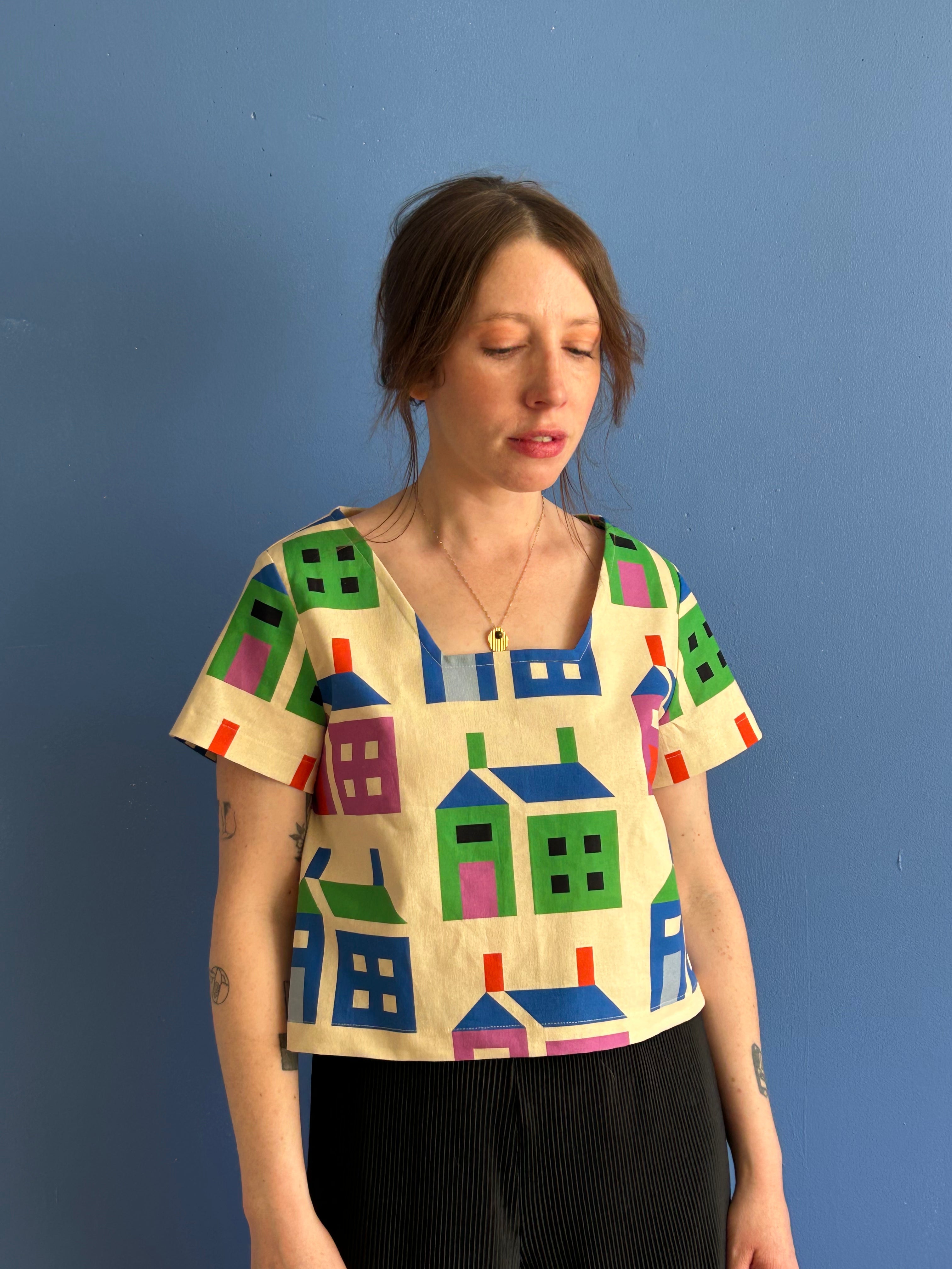 Crop top featuring a square neckline, short sleeves, loose fit, and mid-length.