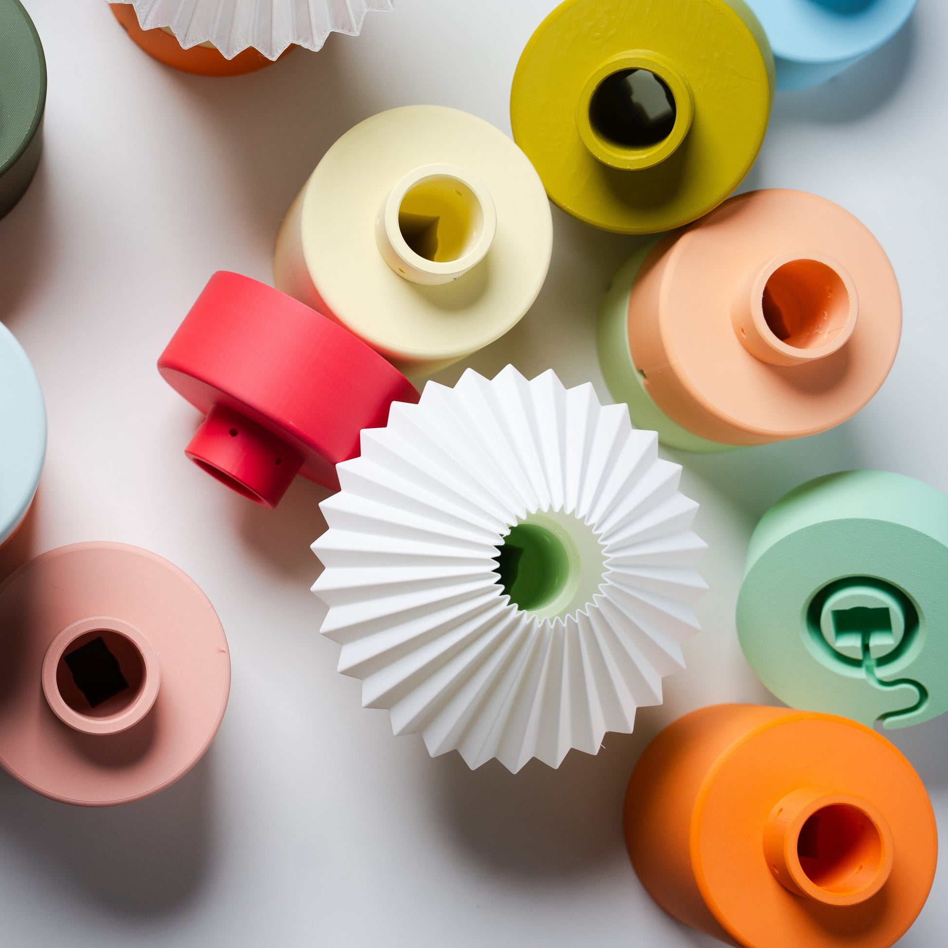 Meet the Cici Lamp, a colorful, modular table lamp with playful modular bases and a pleated, matte shade. Each lamp is made from plant-based PLA in our sunny Charleston, SC studio. It's lighting made with intention, and built to last.