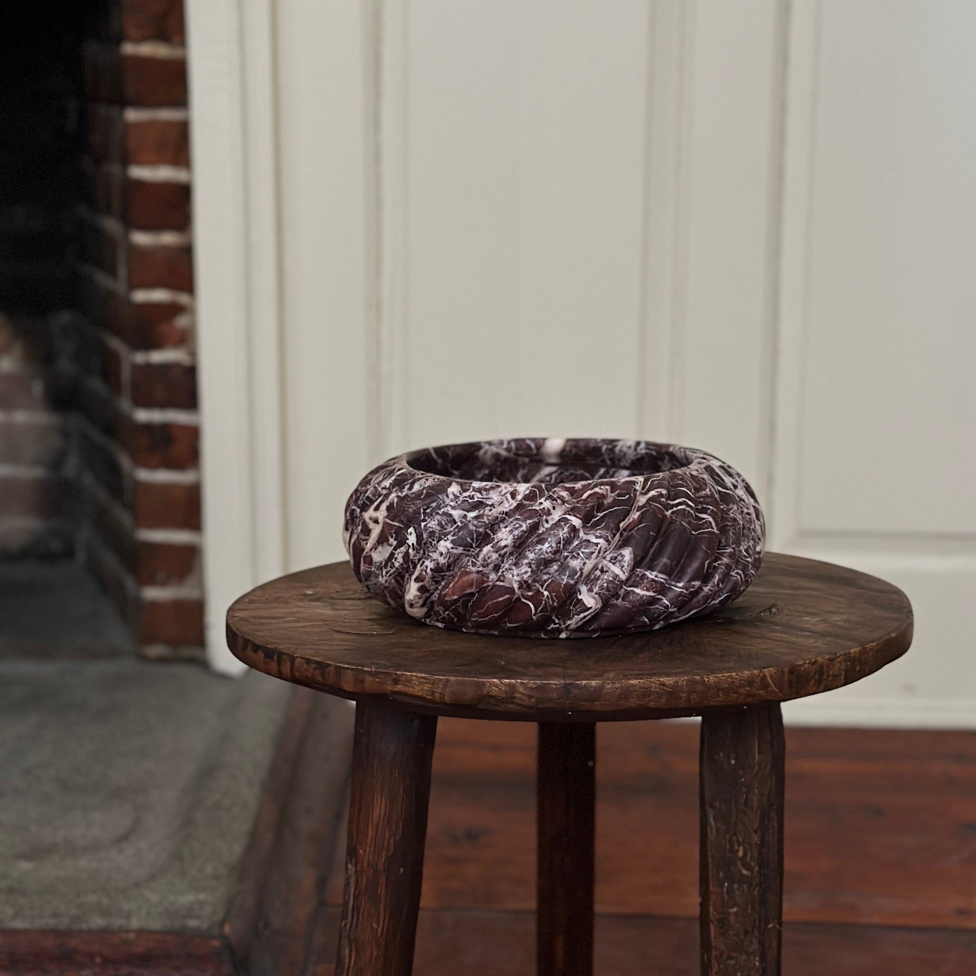 The Cruller Bowl is a heavy set, nine-inch round bowl cut from a single piece of solid stone, hand-finished in a twisted rope motif by artisans in a growing stone atelier in Rajasthan, India.
