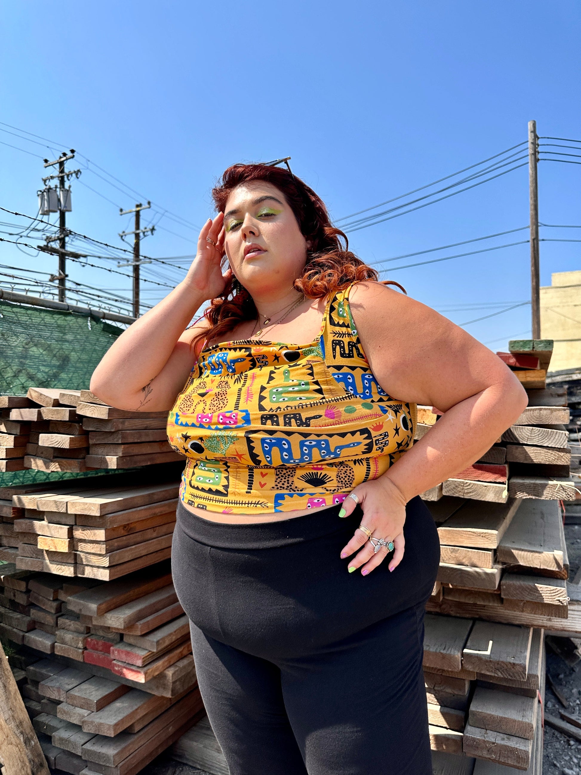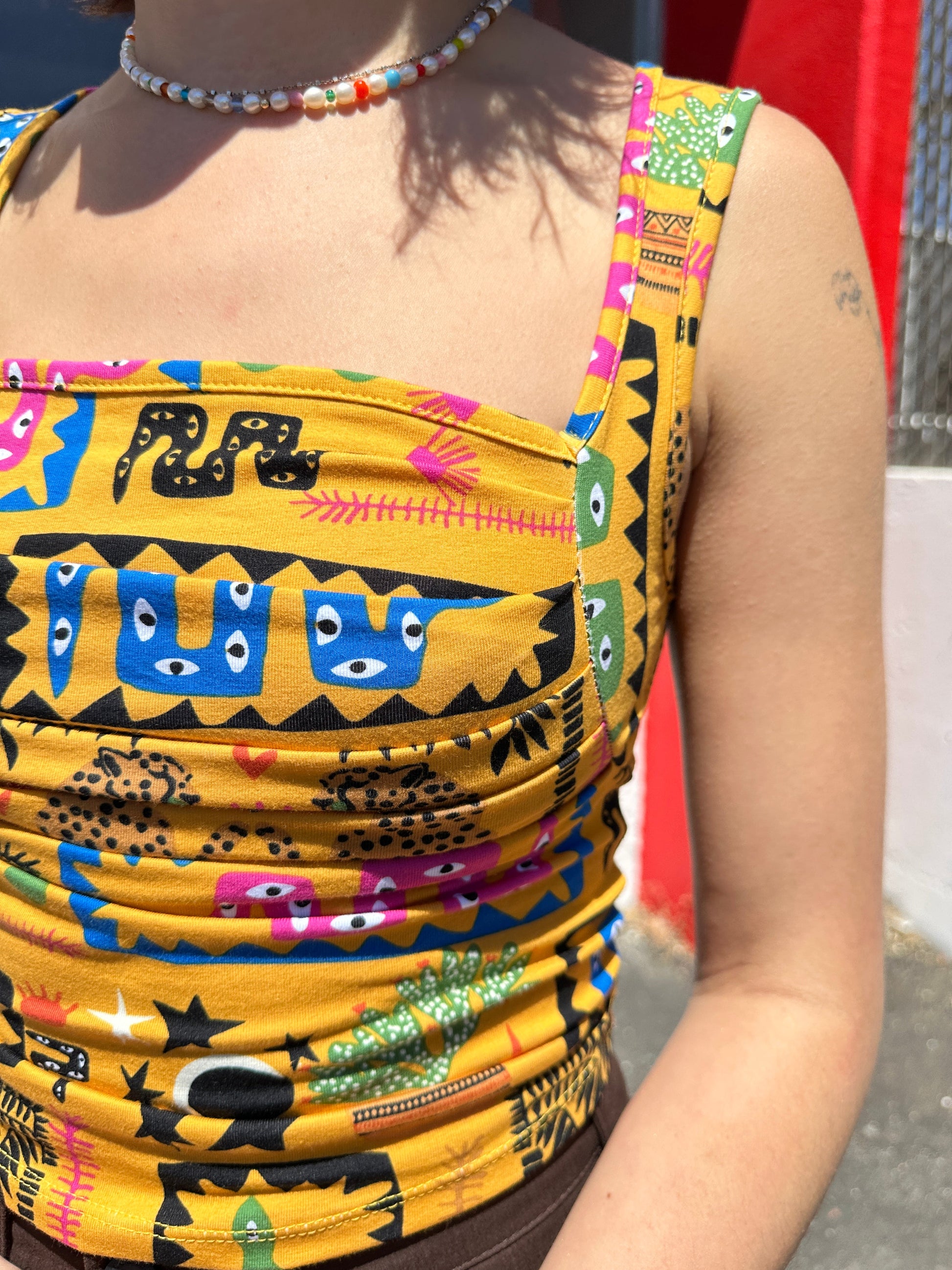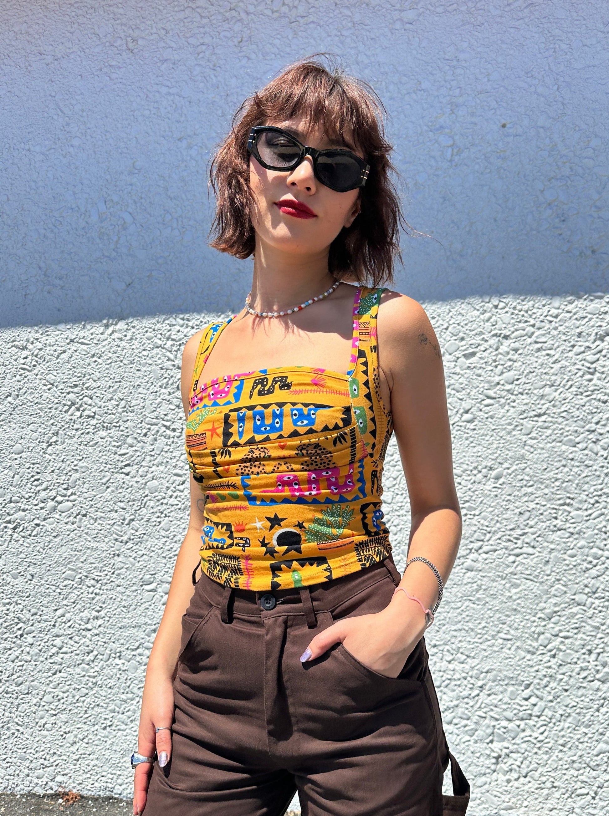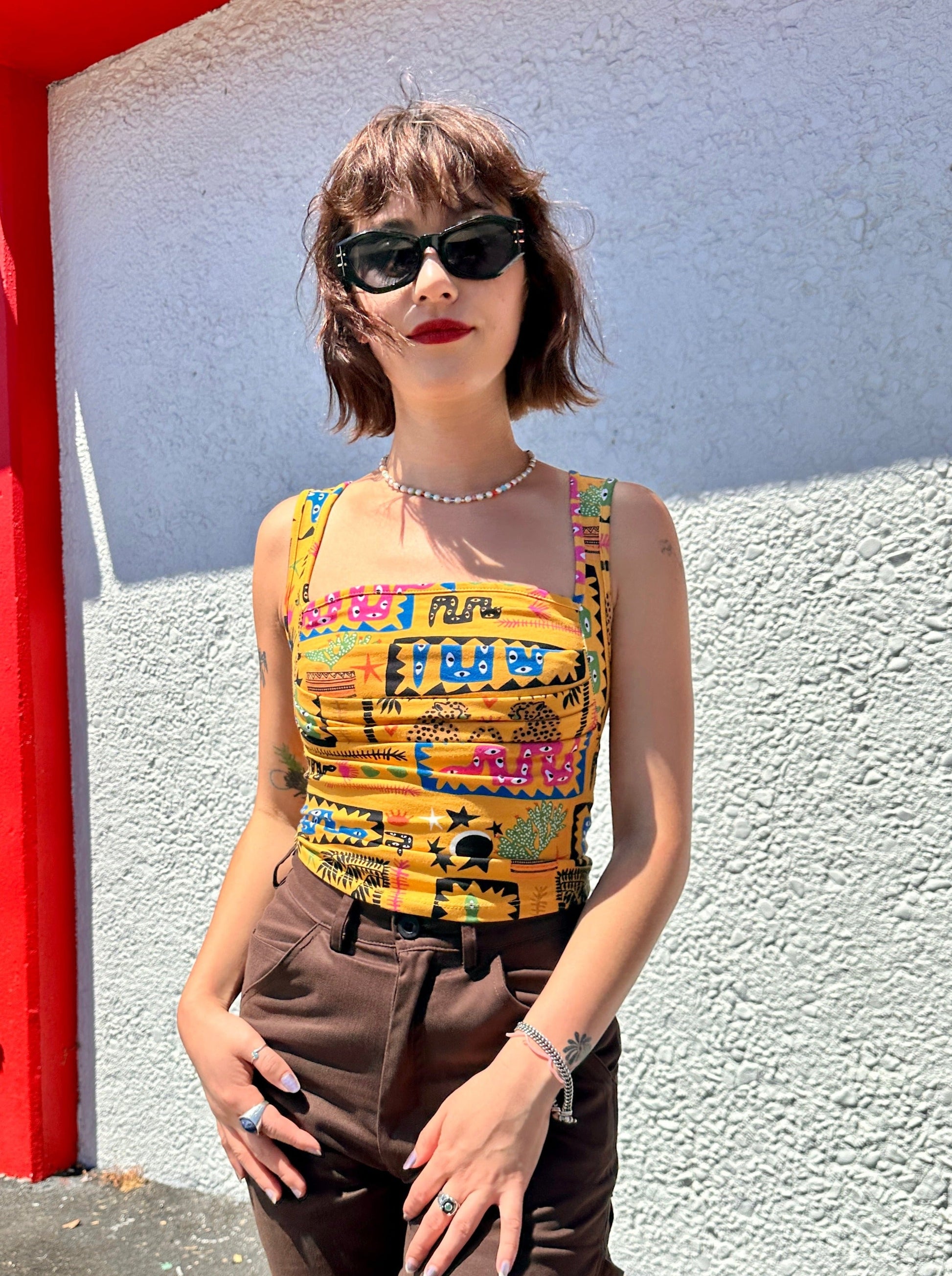 Named after an illustrious 90's queen, this stretch jersey top will spice up any outfit. The form fitting ruched bodice creates a flattering silhouette, and the perfectly square neckline gives this tank just the right amount of 90's edge.