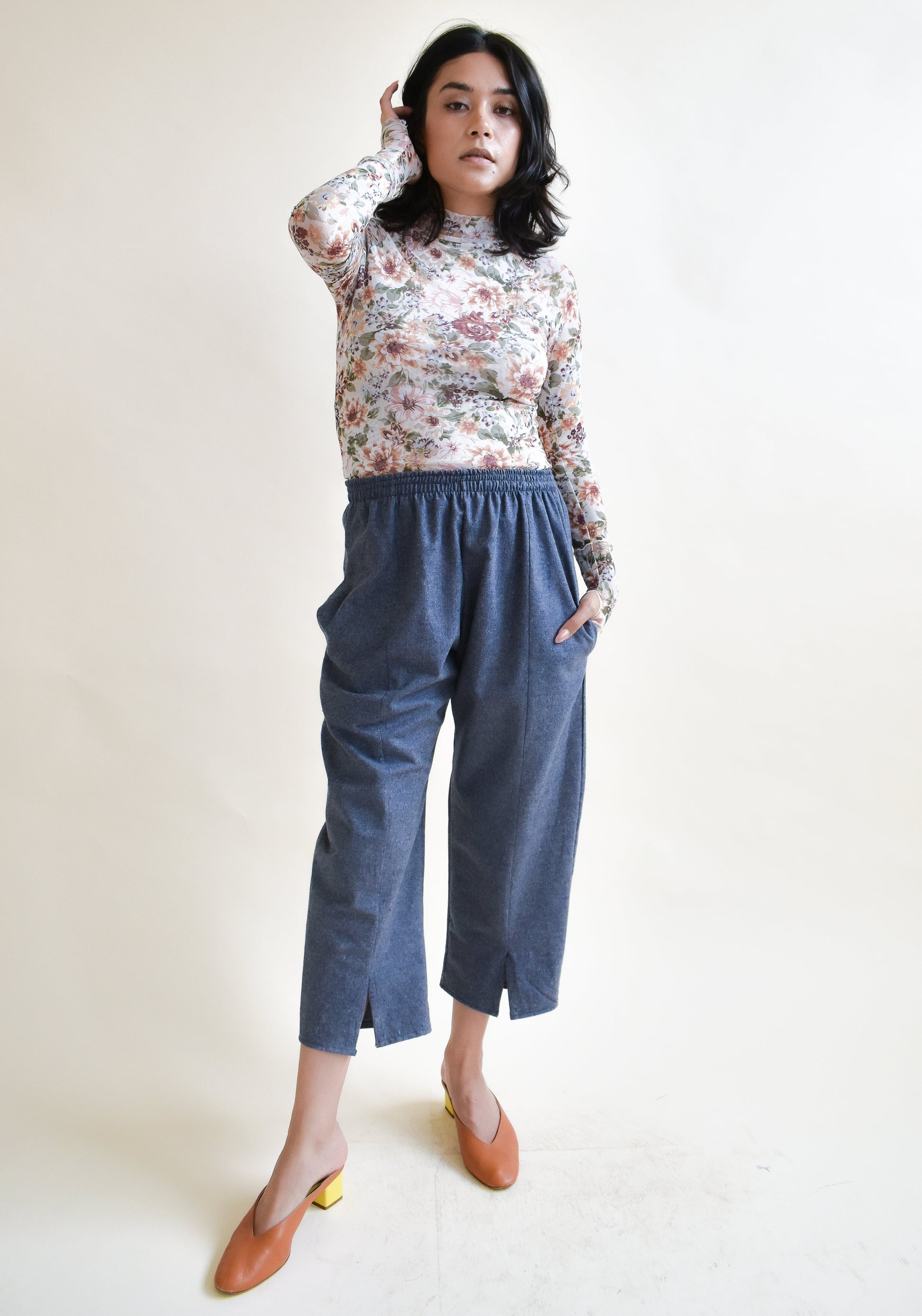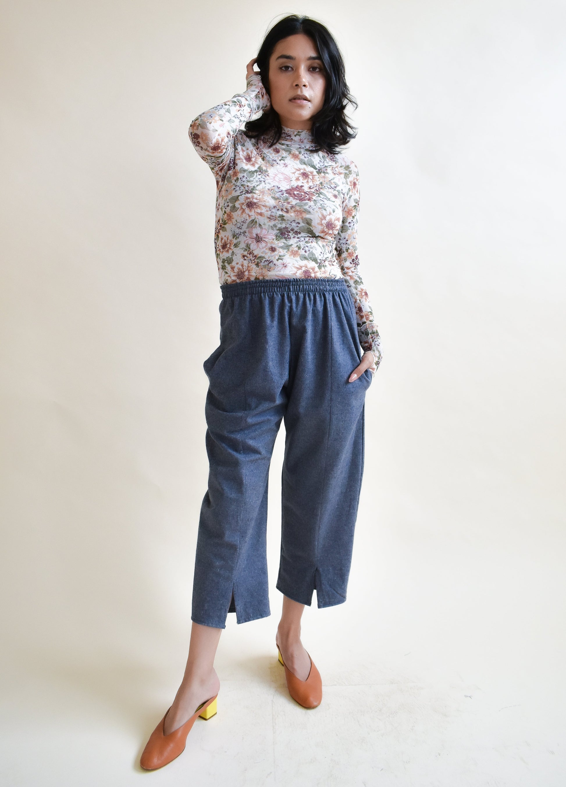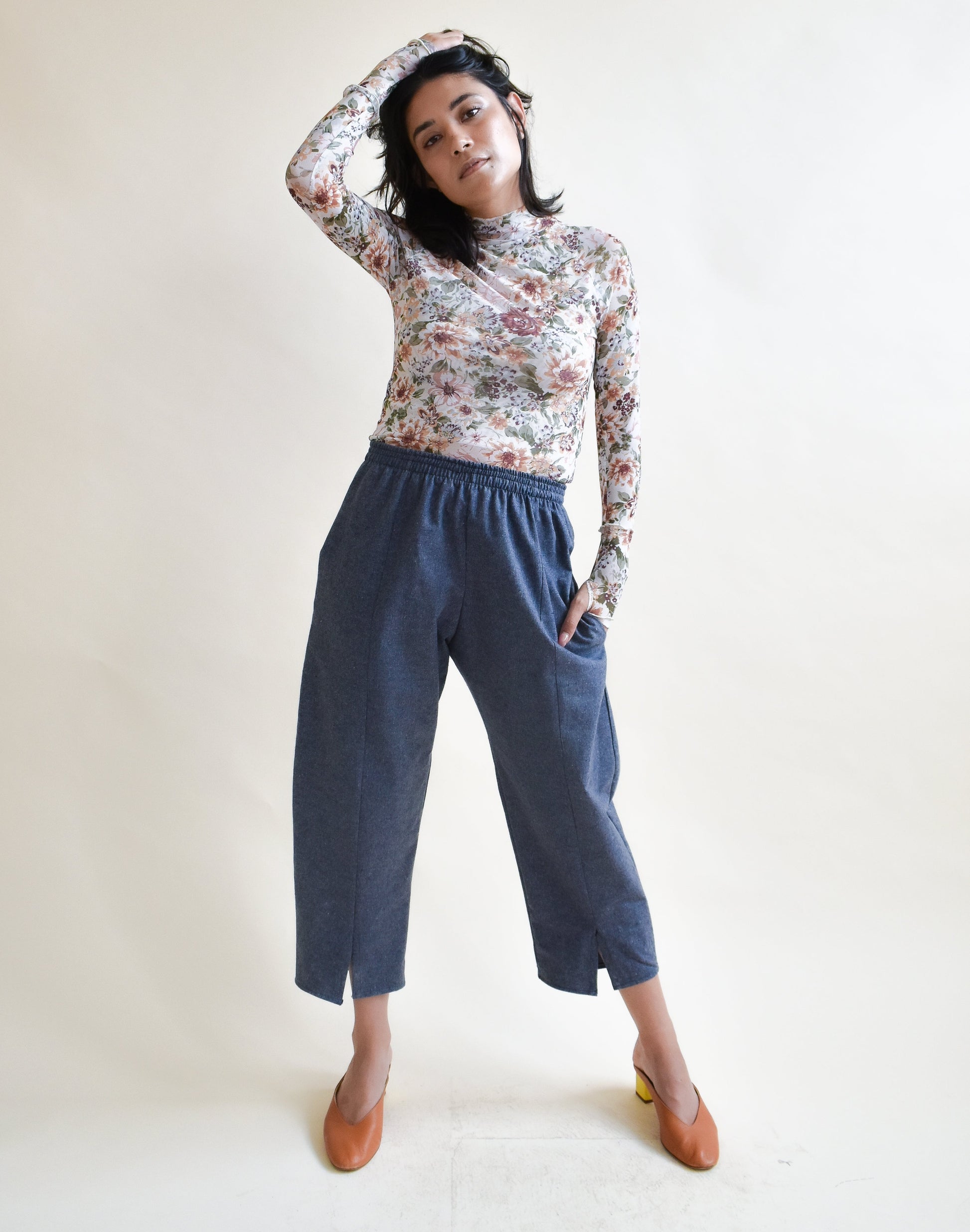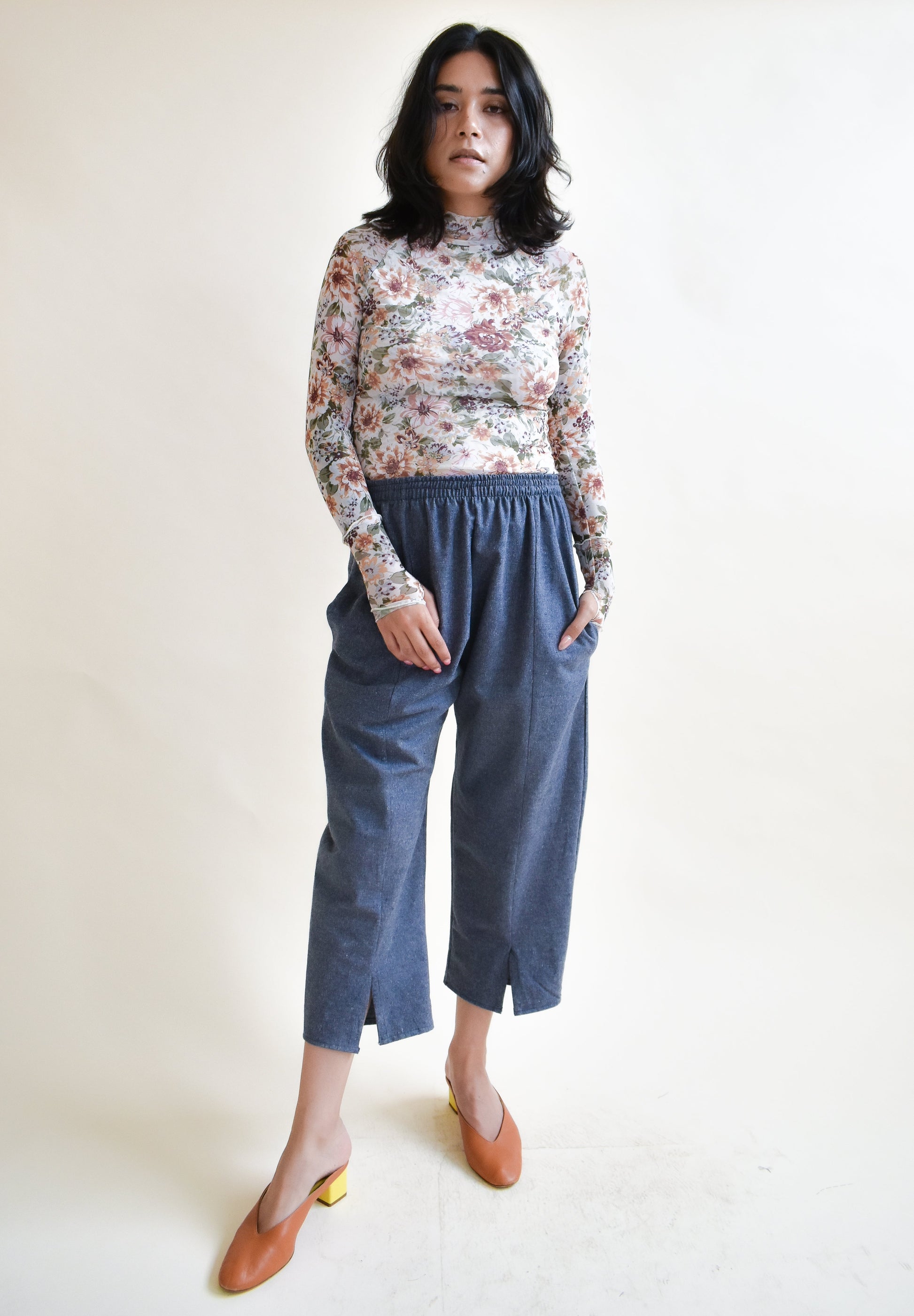 This trouser is a loose fit, elastic waisted pant that feels like butter, but looks super polished. It can be styled up or down to create a sophisticated and effortless aesthetic. With a beautiful seam down the center front and a slit in the center below the knee, it has a tailored look with none of the fuss. Roomy pockets at the side seams, and a cropped length that should land mid-calve.