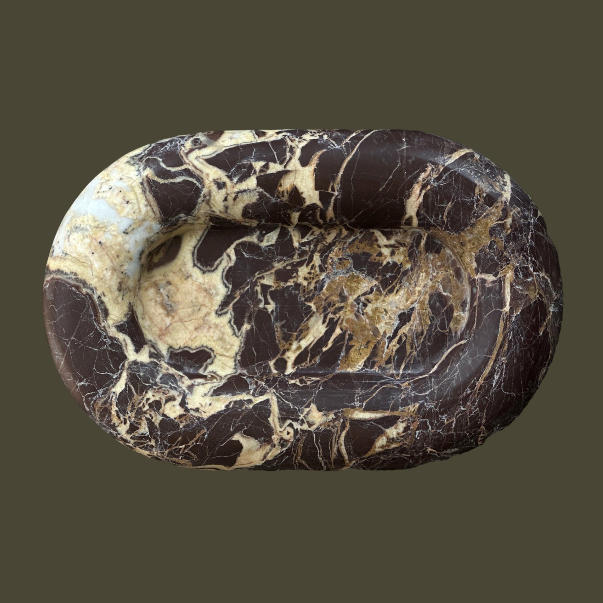 The Maddi is a chunky, six-inch oval catchall cut from a single piece of solid marble or stone with a large, playfully modern “puffed” border, hand-finished by artisans in a growing stone atelier in Rajasthan, India.