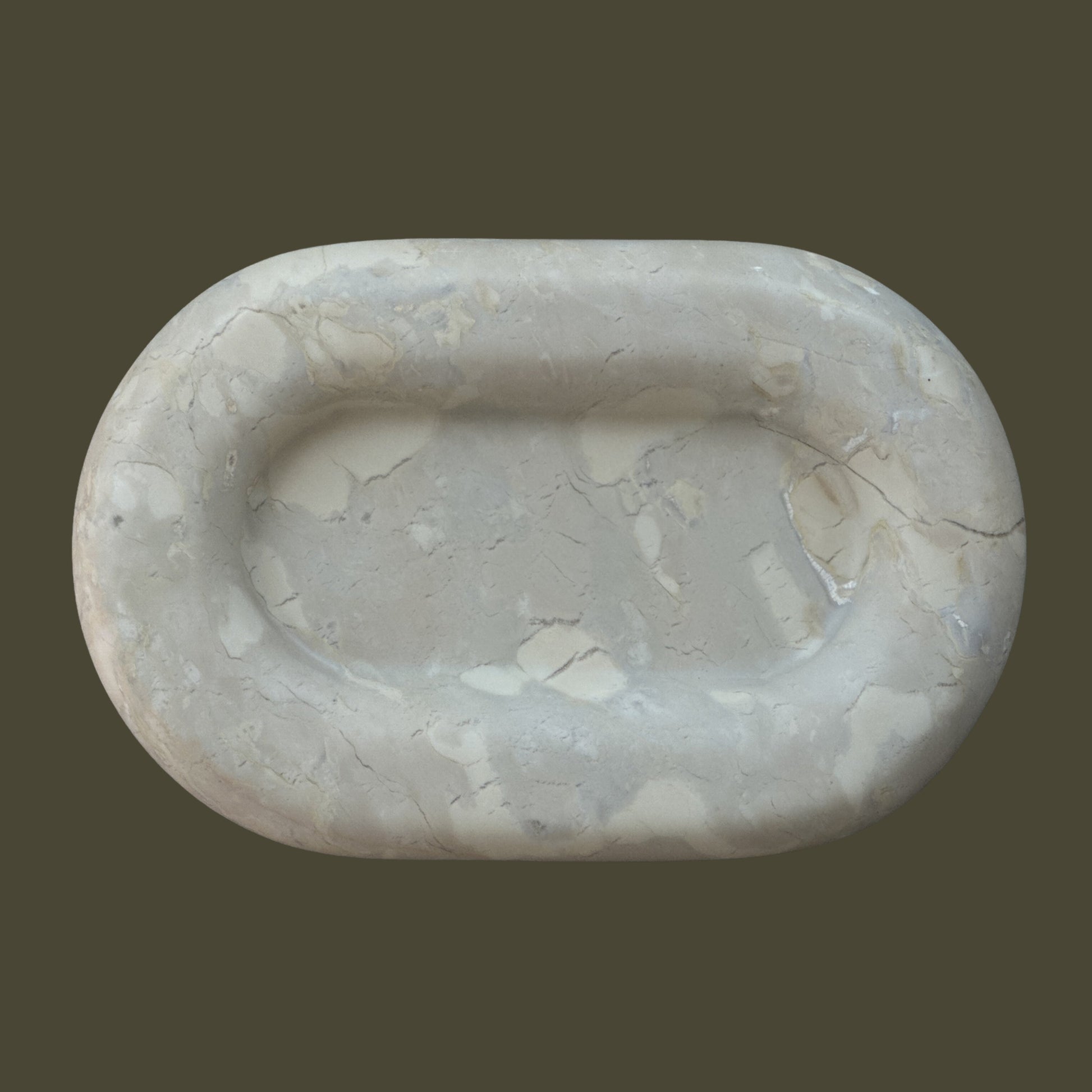 The Maddi is a chunky, six-inch oval catchall cut from a single piece of solid marble or stone with a large, playfully modern “puffed” border, hand-finished by artisans in a growing stone atelier in Rajasthan, India.