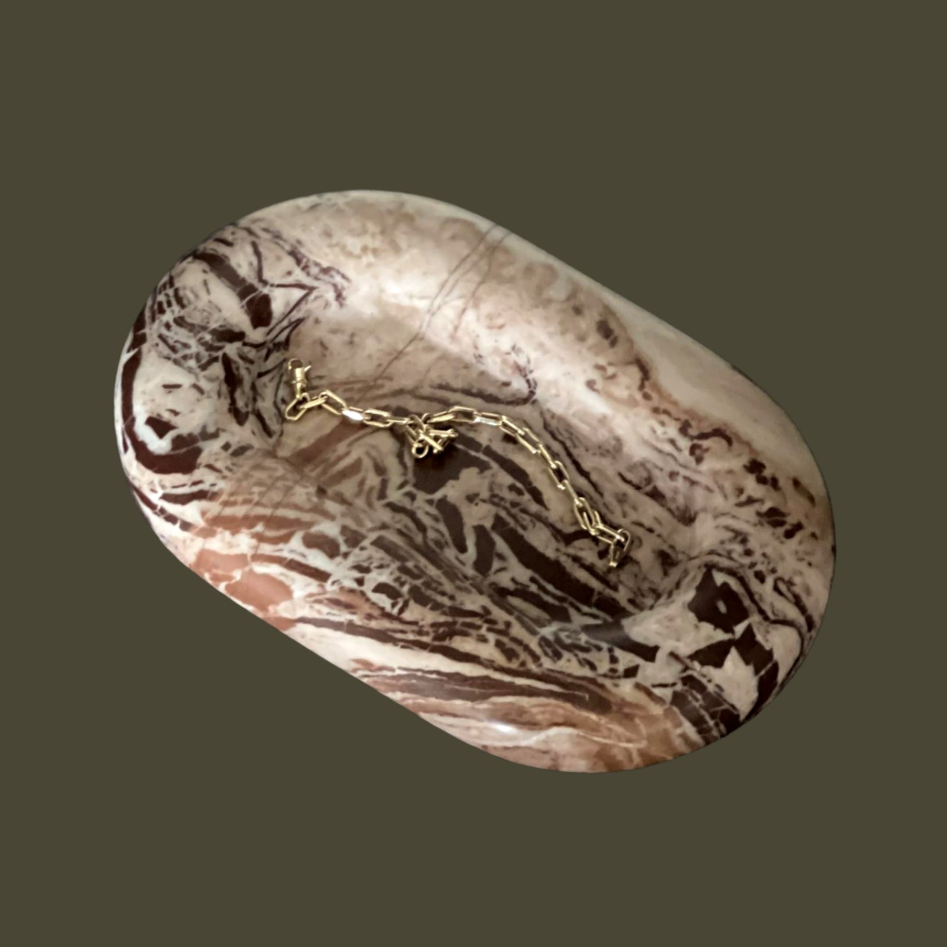 The Maddi is a chunky, six-inch oval catchall cut from a single piece of solid marble or stone with a large, playfully modern “puffed” border, hand-finished by artisans in a growing stone atelier in Rajasthan, India.