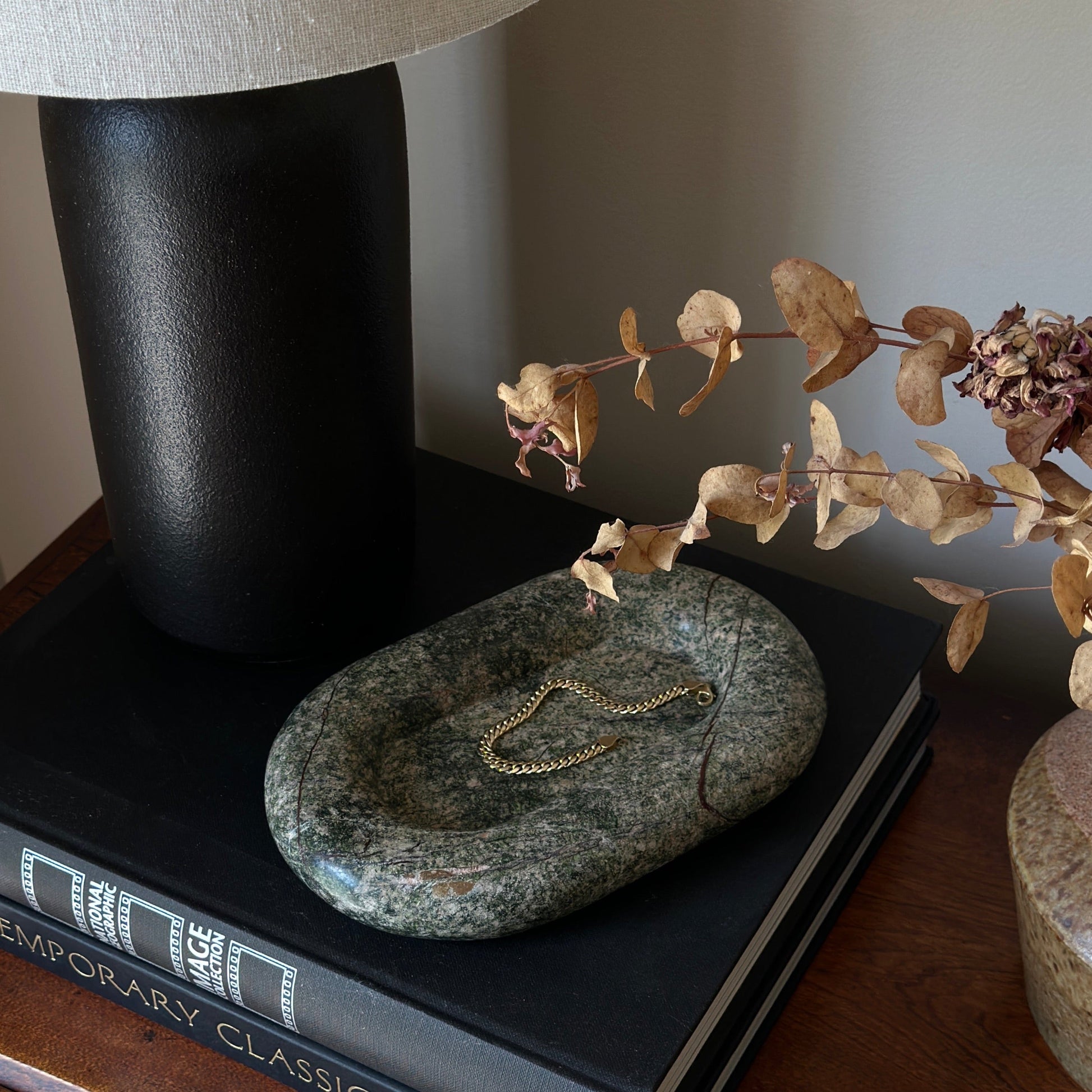 The Maddi is a chunky, six-inch oval catchall cut from a single piece of solid marble or stone with a large, playfully modern “puffed” border, hand-finished by artisans in a growing stone atelier in Rajasthan, India.