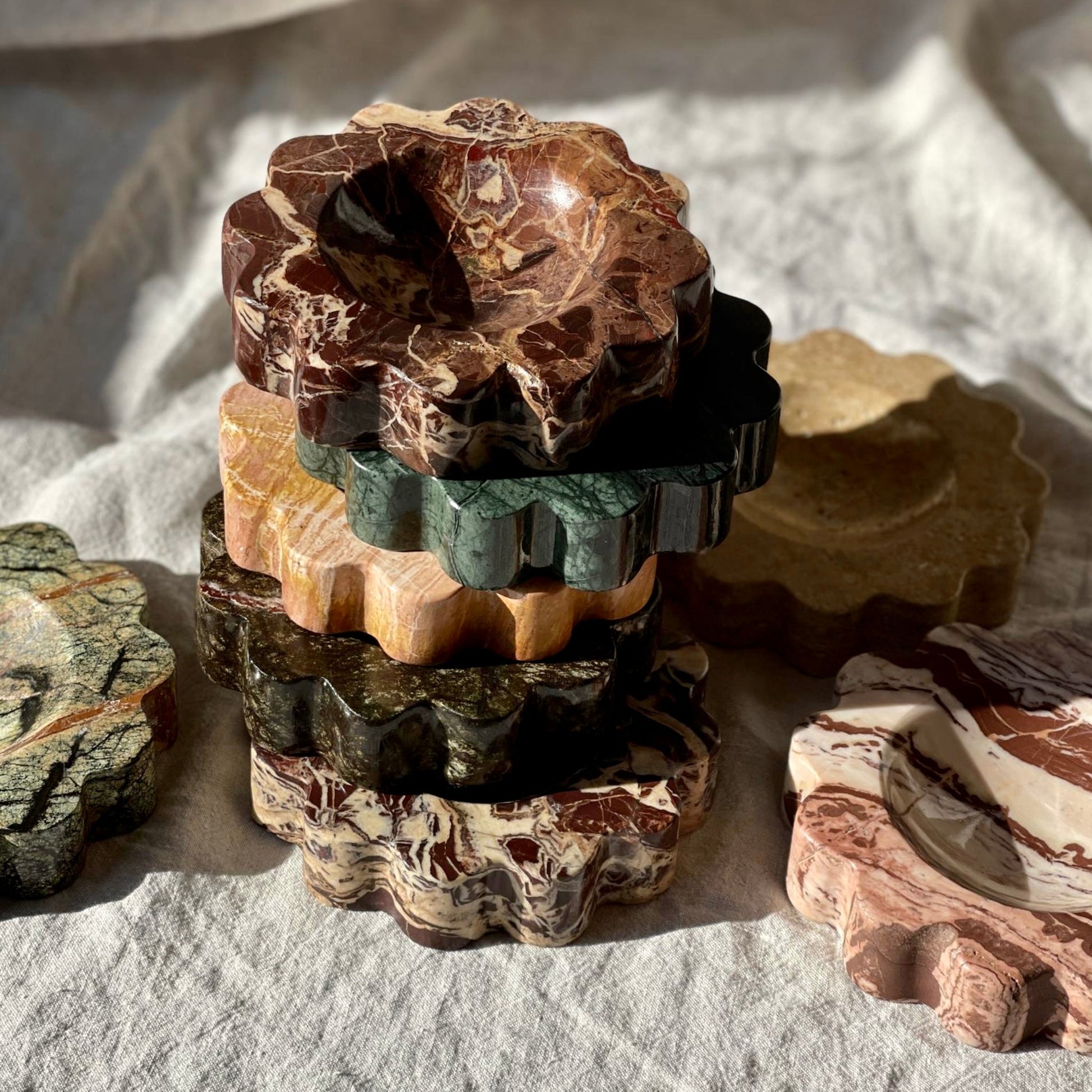 The Mini Sun is a sculptural five inch round catchall cut from a single piece of solid marble or stone with scalloped edges, hand-finished by artisans in a growing stone atelier in Rajasthan, India.