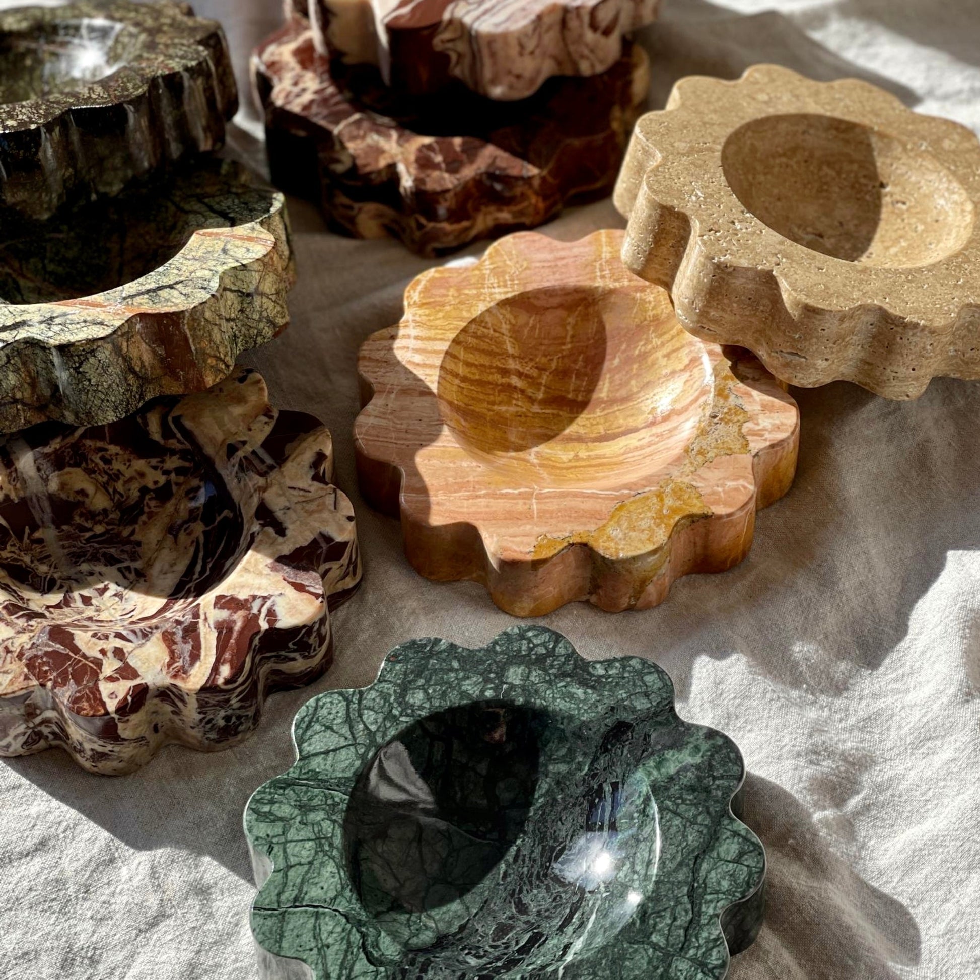 Subtle scallop variations and patterns should be expected and embraced as this is a hand-finished object made of natural stone.