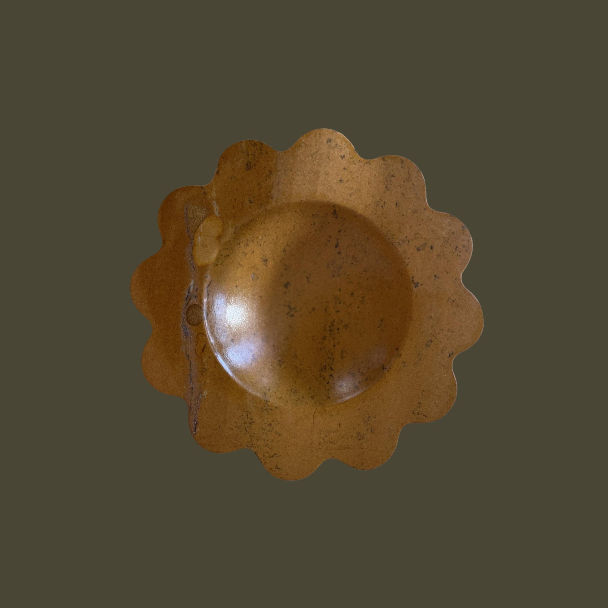 The Mini Sun is a sculptural five inch round catchall cut from a single piece of solid marble or stone with scalloped edges, hand-finished by artisans in a growing stone atelier in Rajasthan, India.