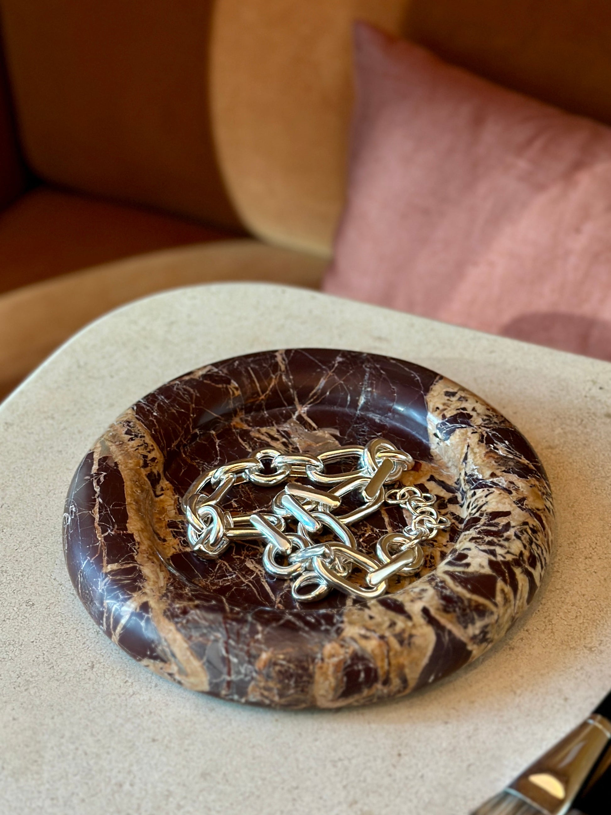 The Ty is a chunky, eight-inch square catchall cut from a single piece of solid marble or stone with a large, playfully modern “puffed” border, hand-finished by artisans in a growing stone atelier in Rajasthan, India.