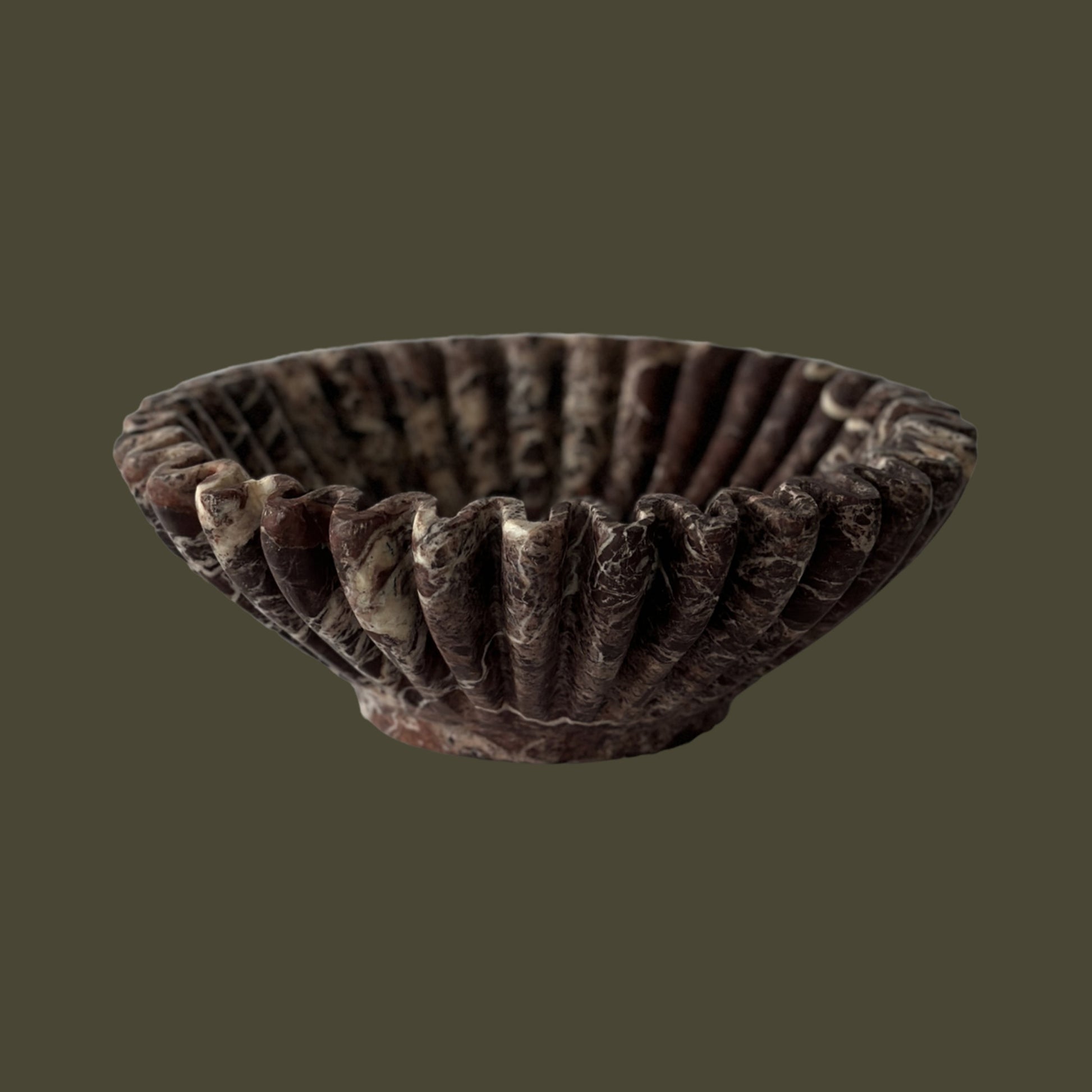 The Ruffle Bowl is a heavy set, nine-inch round bowl cut from a single piece of solid stone, hand-finished in a twisted rope motif by artisans in a growing stone atelier in Rajasthan, India.