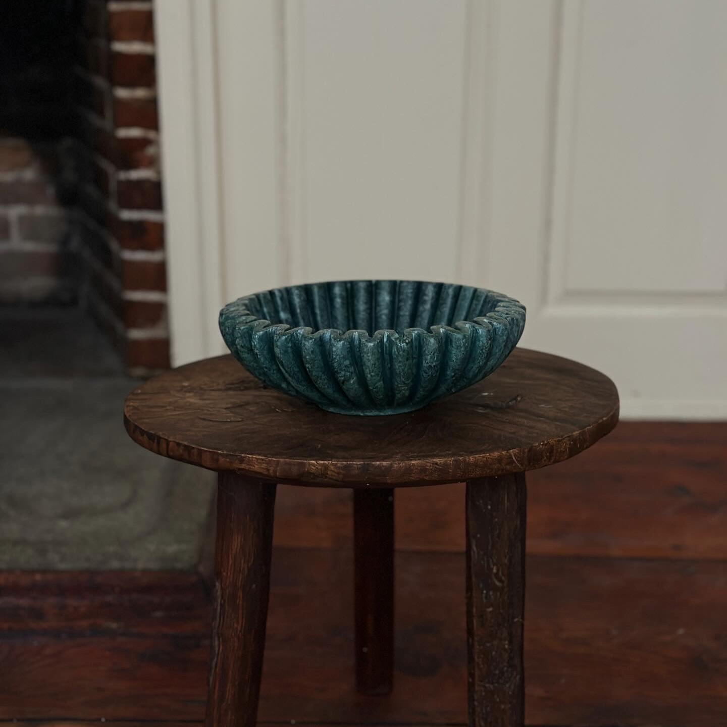 The Ruffle Bowl is a heavy set, nine-inch round bowl cut from a single piece of solid stone, hand-finished in a twisted rope motif by artisans in a growing stone atelier in Rajasthan, India.