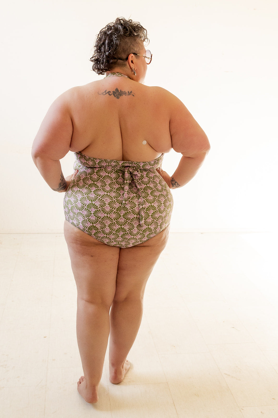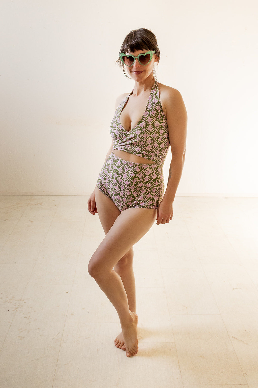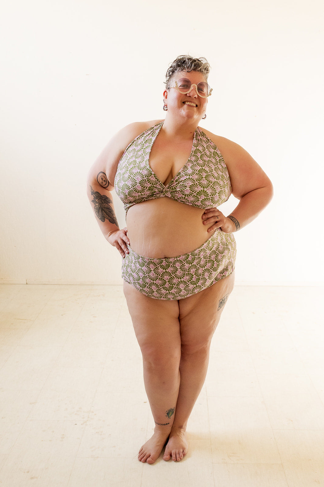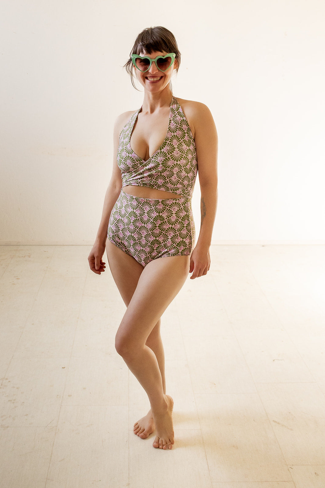 This piece is made of a four way stretch lycra swim material with a halter neck and high waisted bottoms. The tie front can be worn in multiple ways of your choosing. Hand wash and line dry.