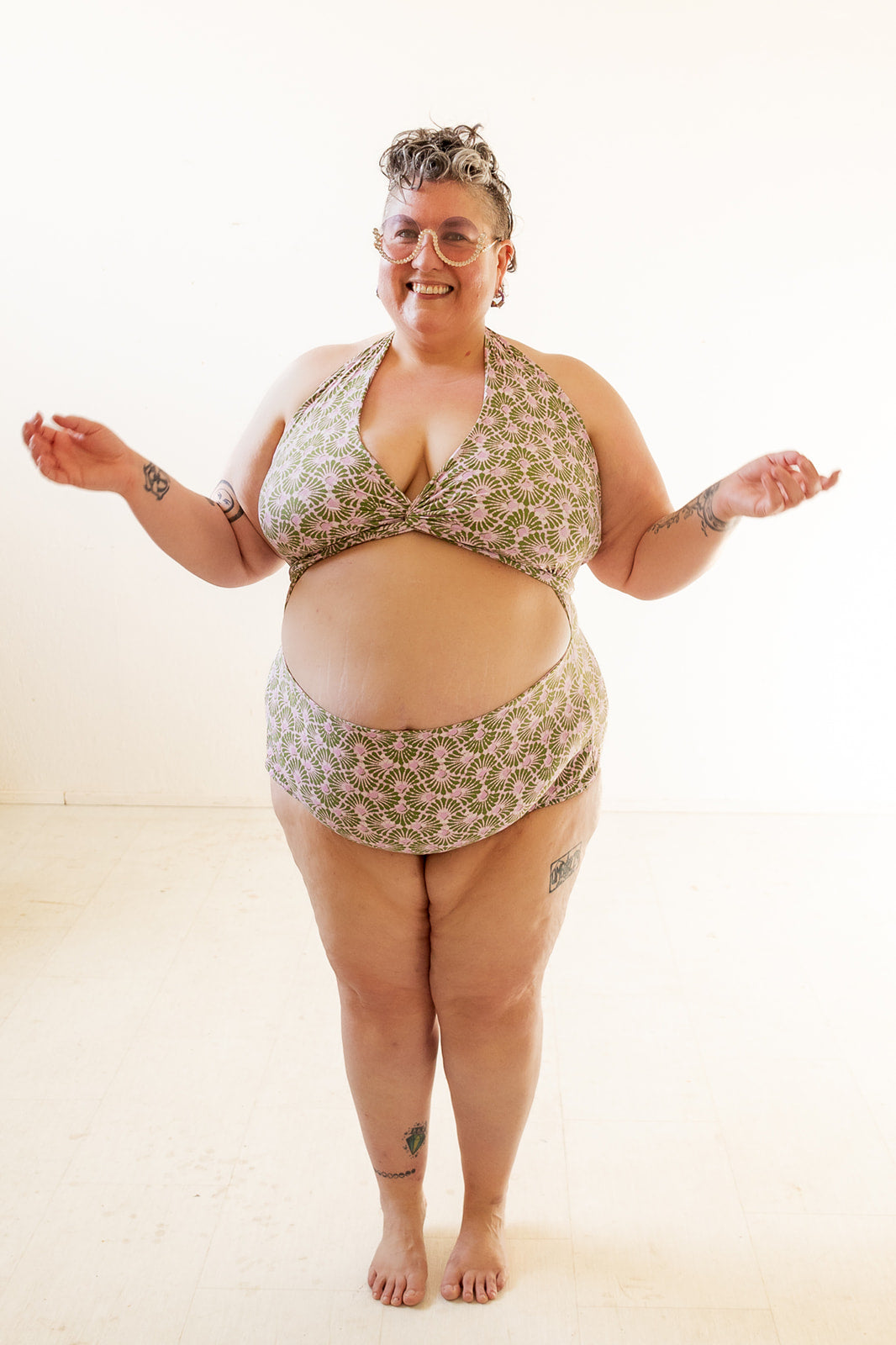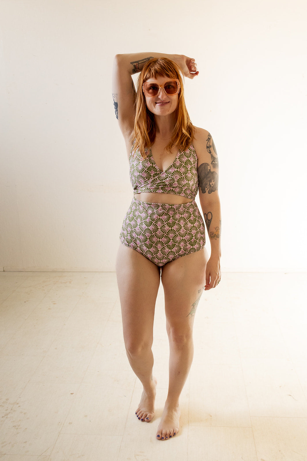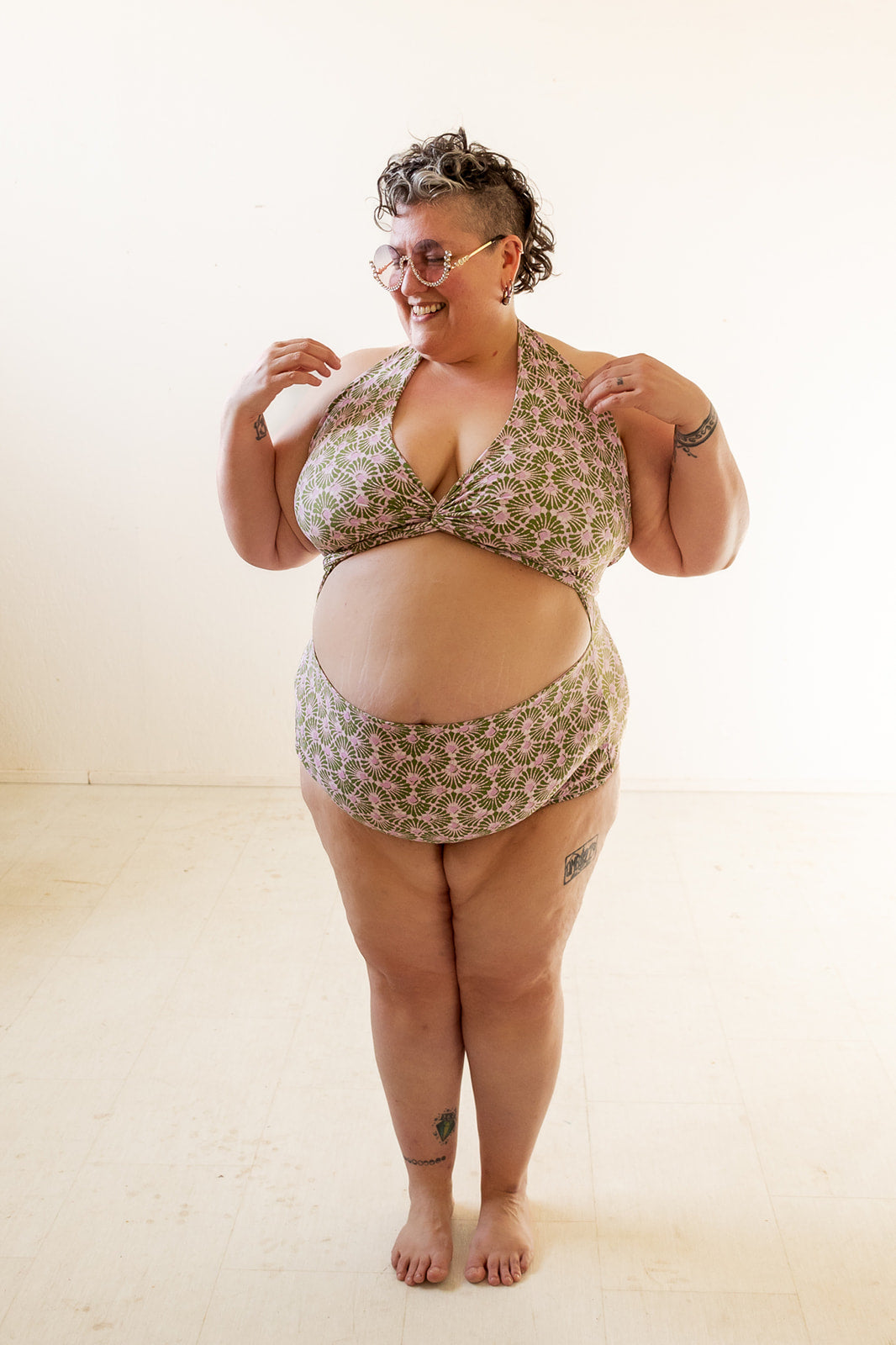This piece is made of a four way stretch lycra swim material with a halter neck and high waisted bottoms. The tie front can be worn in multiple ways of your choosing. Hand wash and line dry.