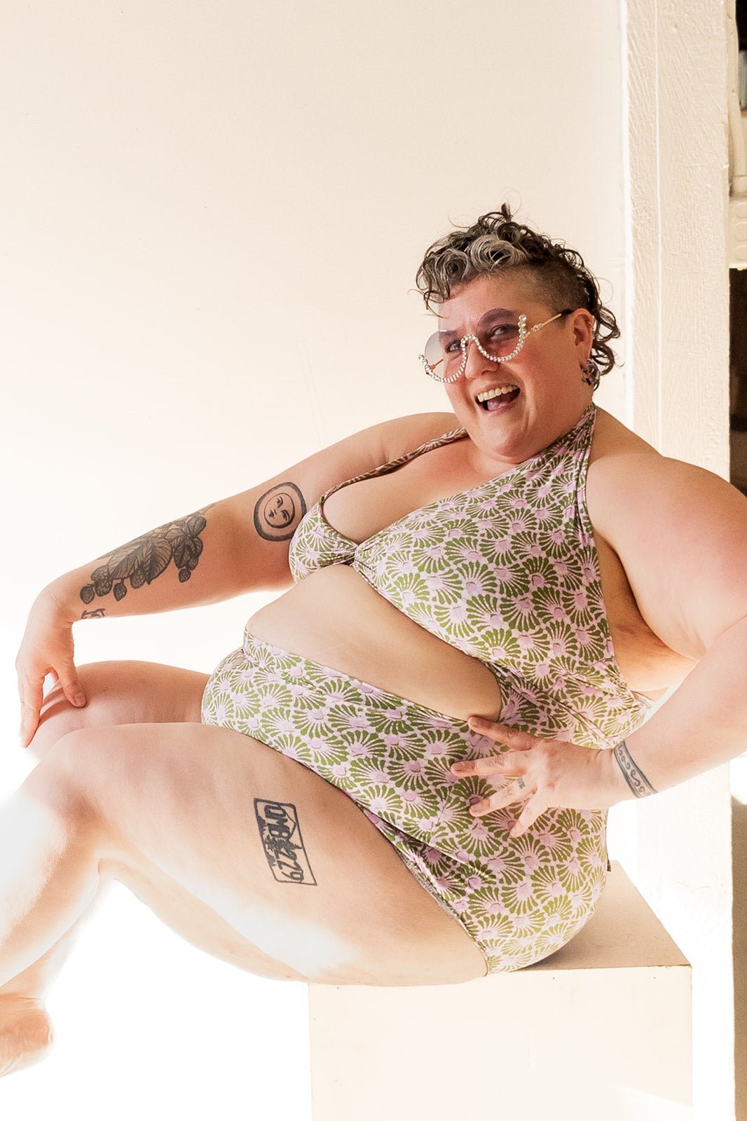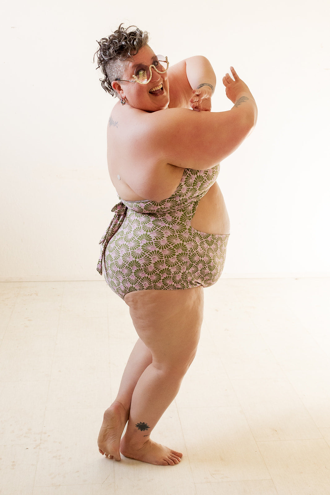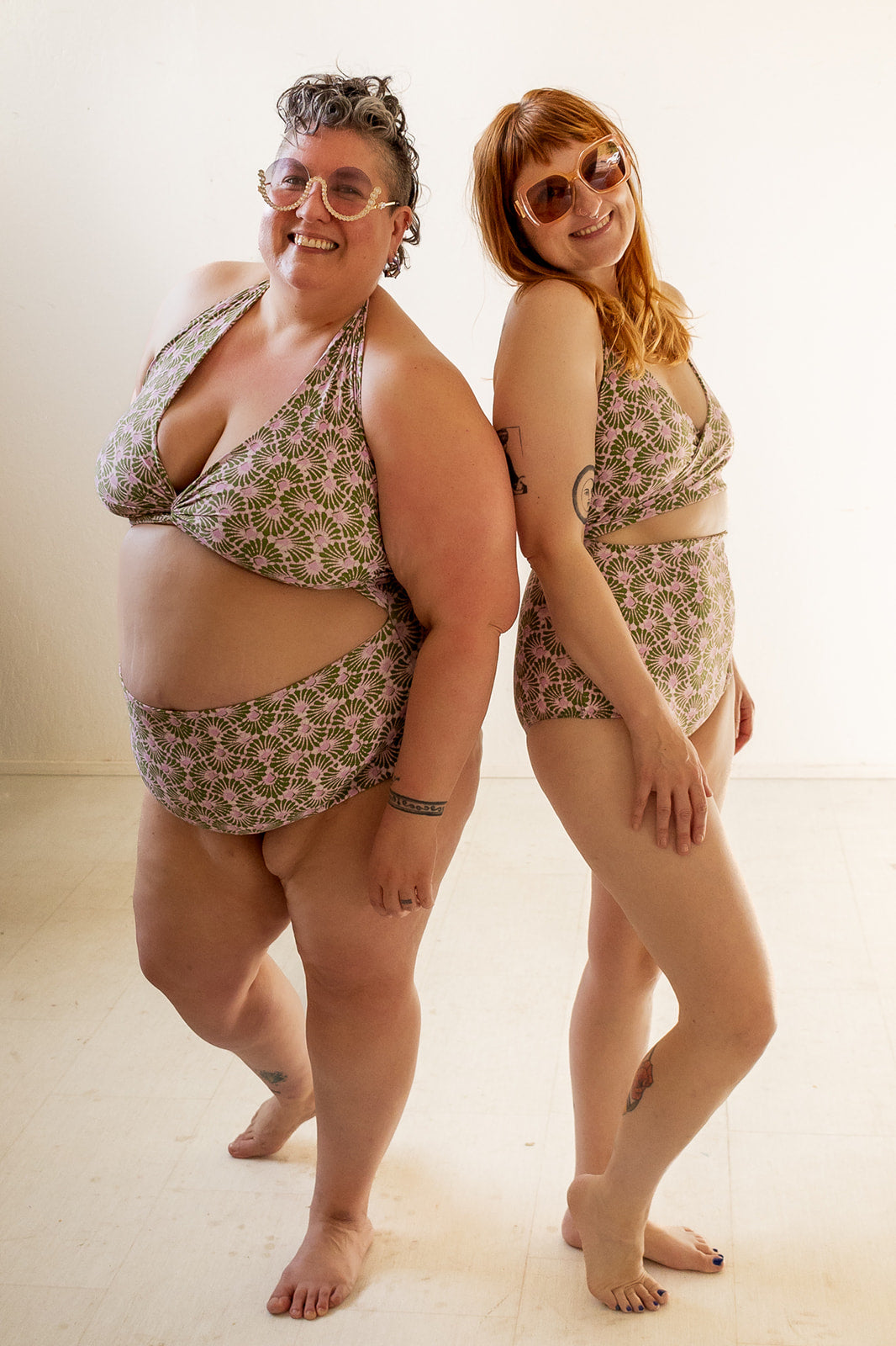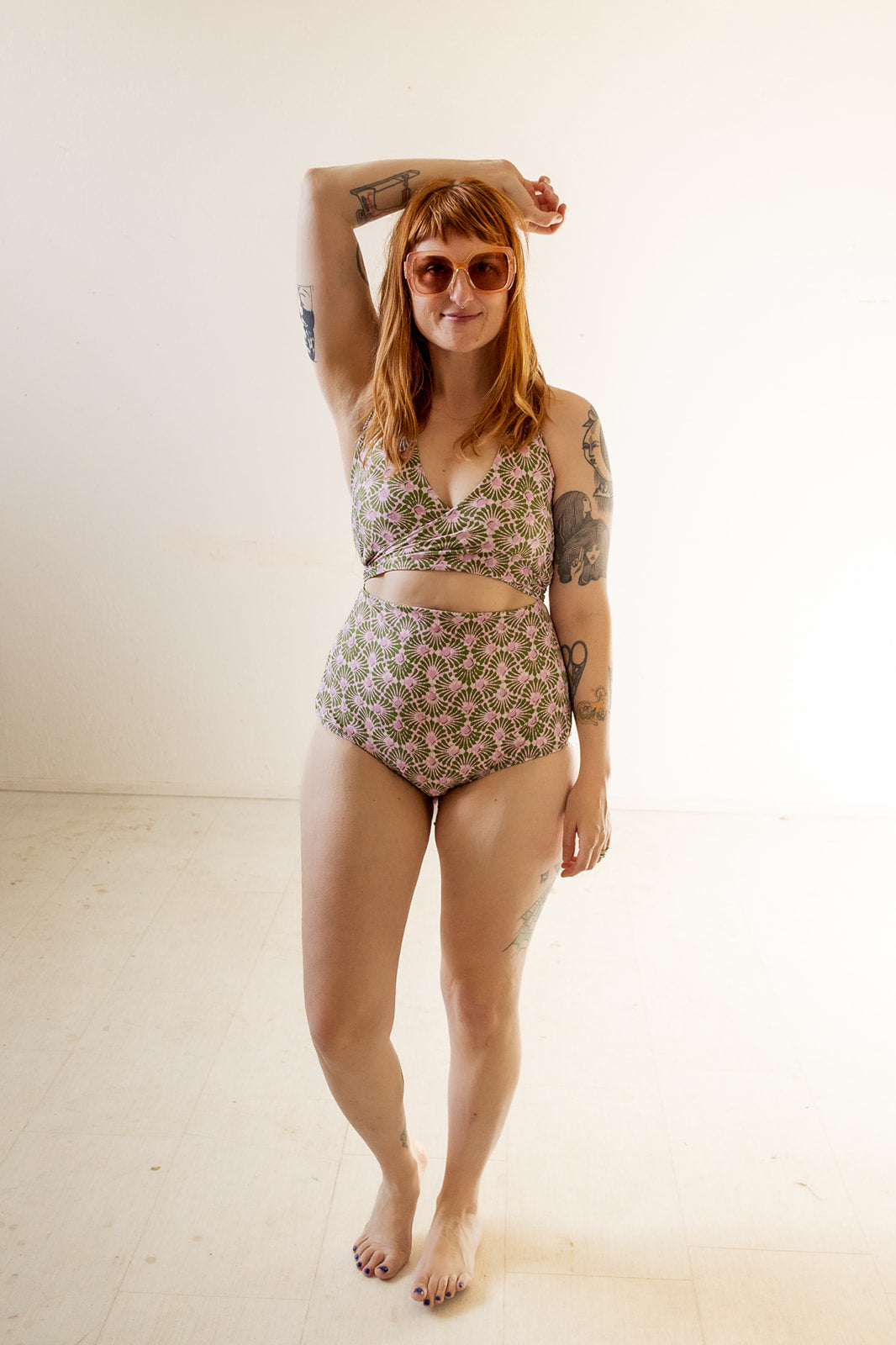 This piece is made of a four way stretch lycra swim material with a halter neck and high waisted bottoms. The tie front can be worn in multiple ways of your choosing. Hand wash and line dry.