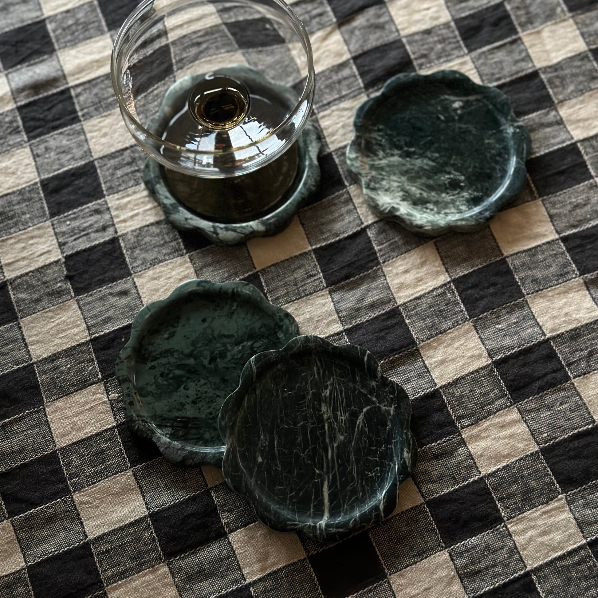 The Coasters are a set of 4 three inch scalloped beverage coasters cut from a single piece of solid marble, hand-finished by artisans in a growing stone atelier in Rajasthan, India.