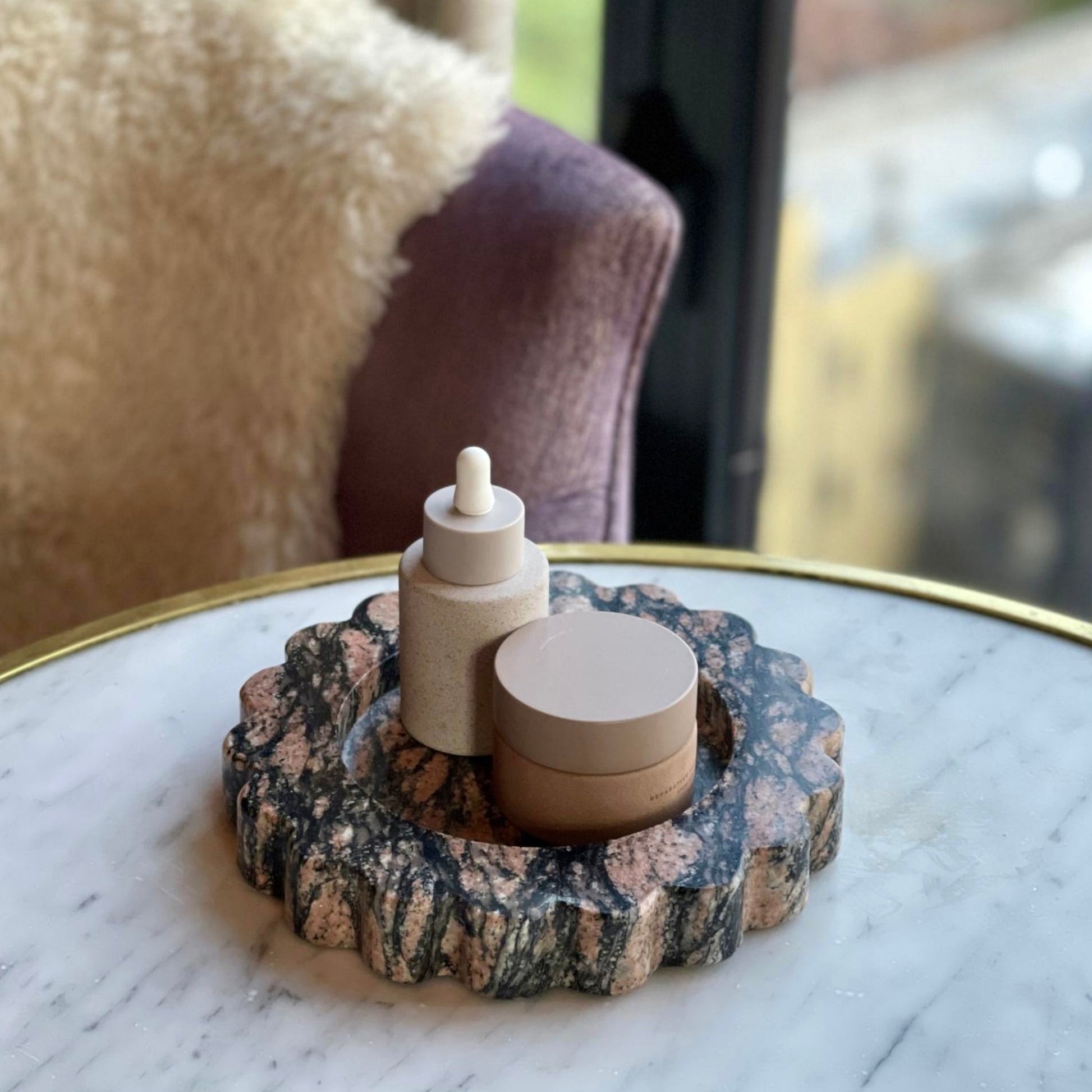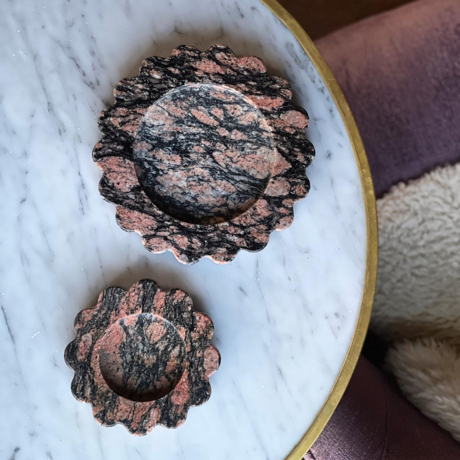 The Sun is a sculptural eight inch round tray cut from a single piece of solid marble or stone with scalloped edges, hand-finished by artisans in a growing stone atelier in Rajasthan, India.