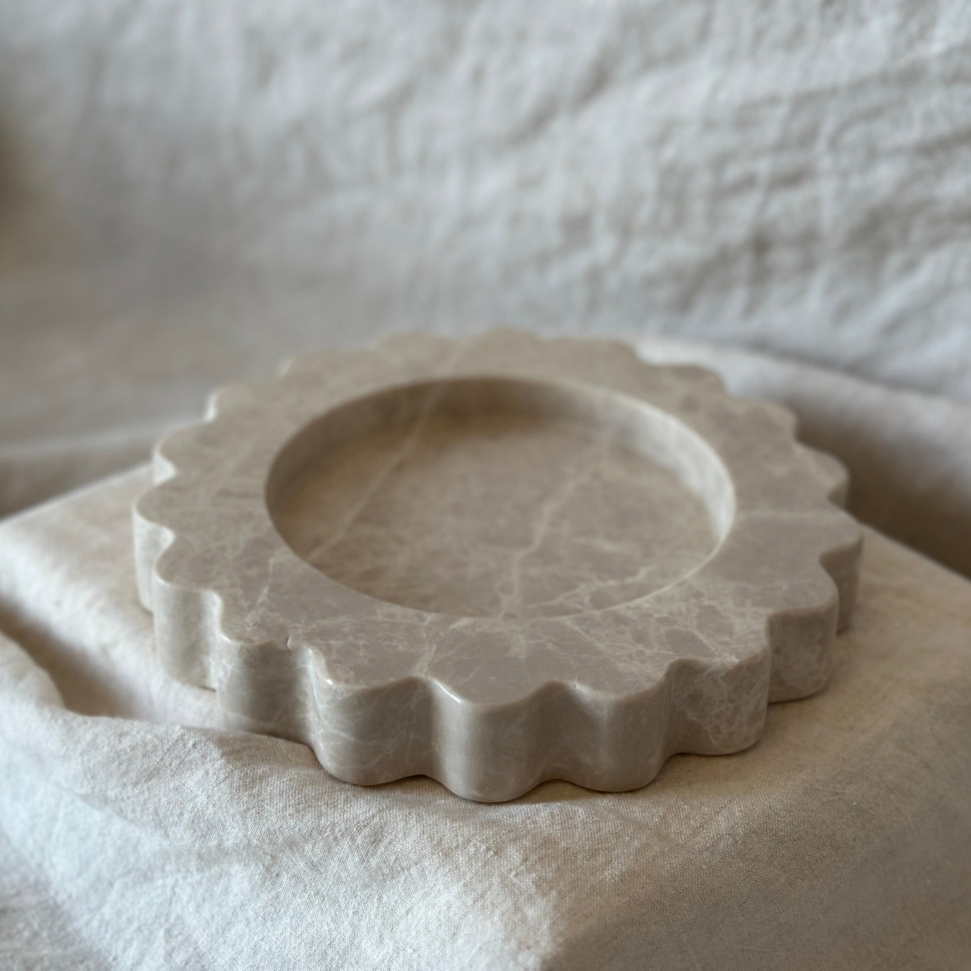 The Sun is a sculptural eight inch round tray cut from a single piece of solid marble or stone with scalloped edges, hand-finished by artisans in a growing stone atelier in Rajasthan, India.