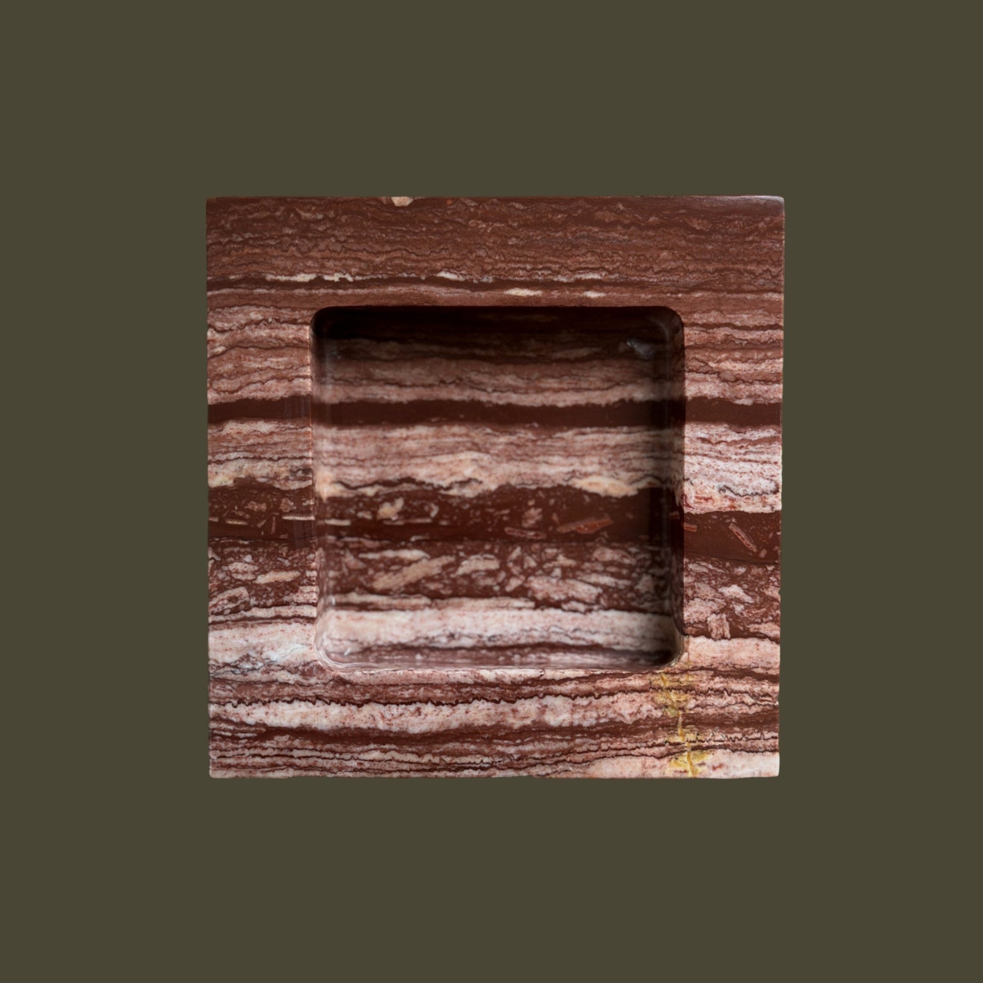 The Teo is a chunky, five and half-inch square catchall cut from a single piece of solid marble or stone with perfectly imperfect lines, hand-finished by artisans in a growing stone atelier in Rajasthan, India.